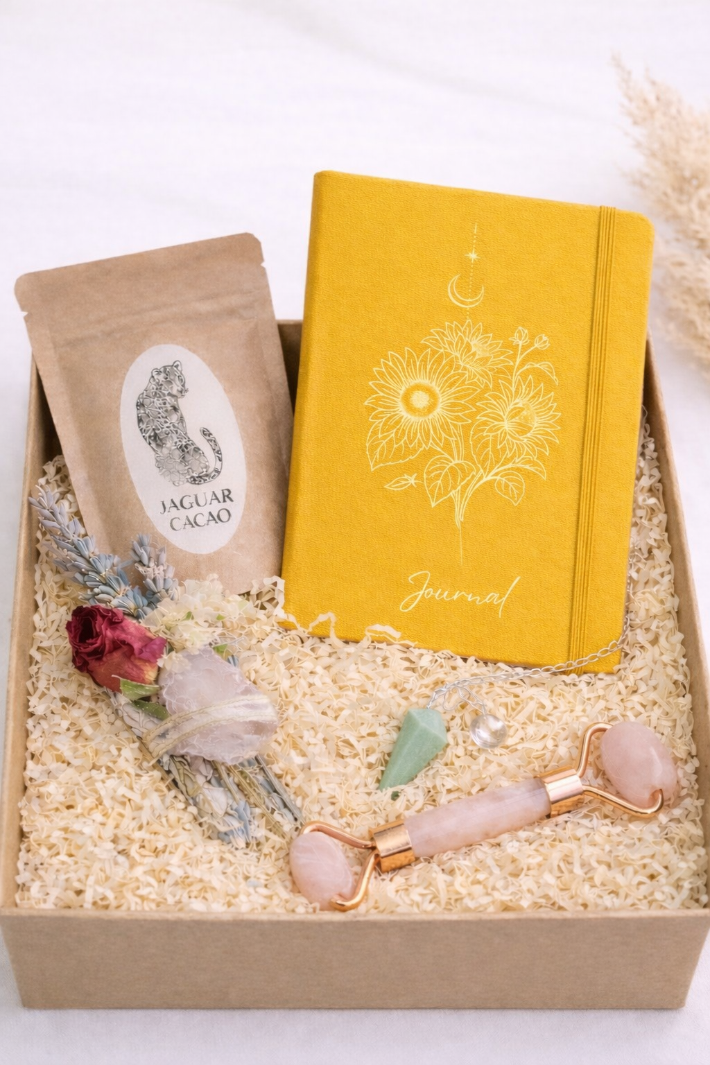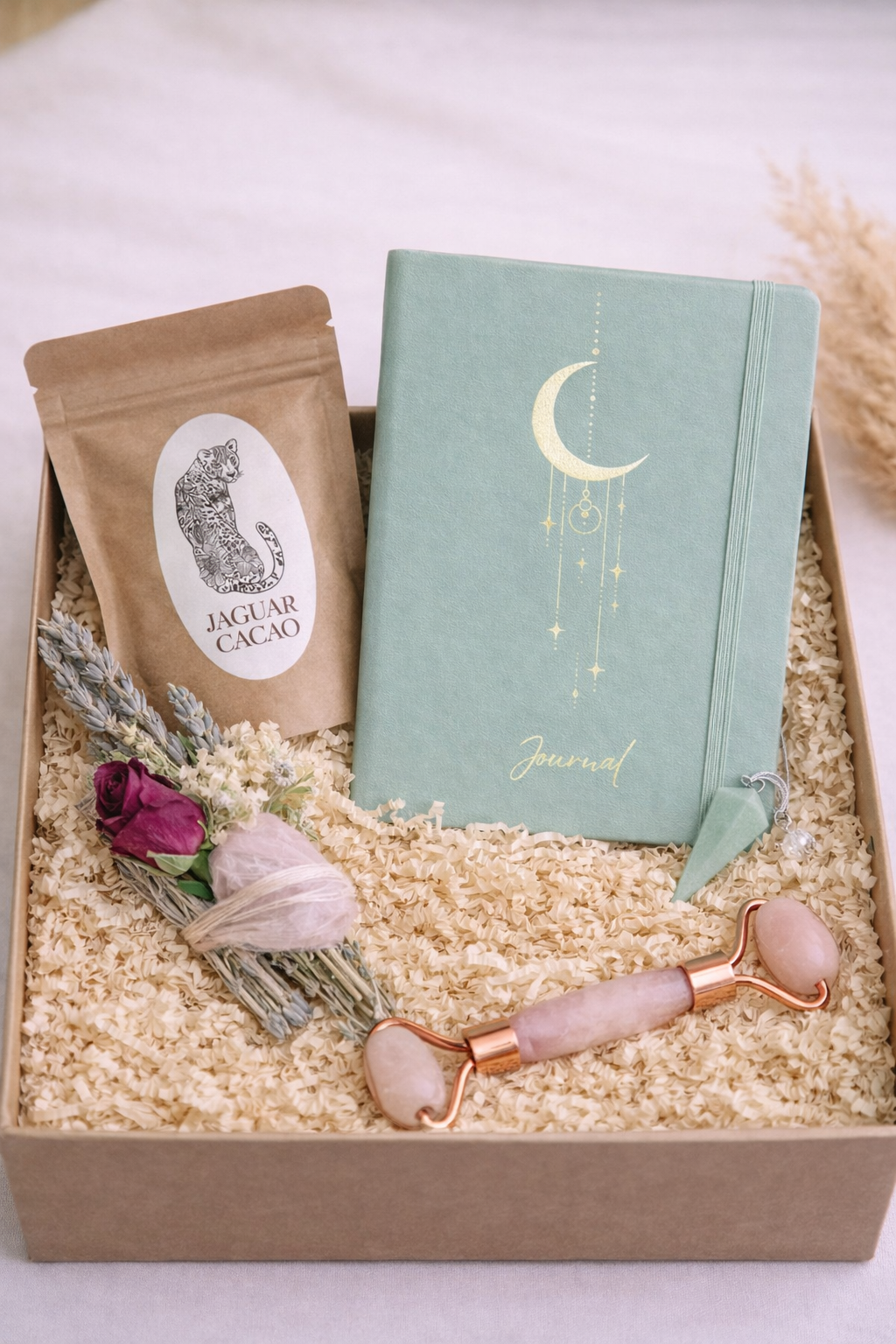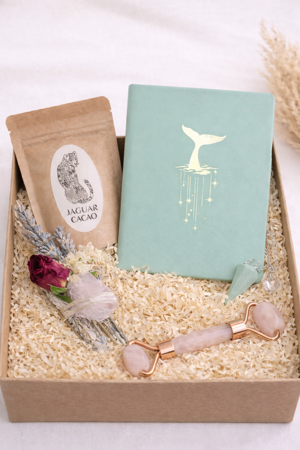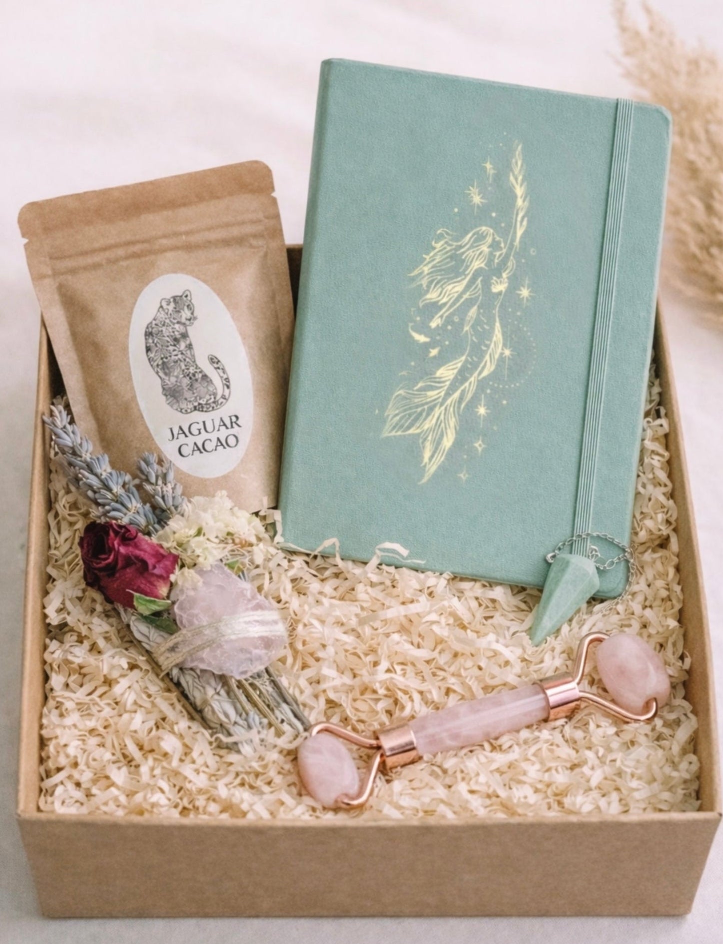 This Bundle includes a unique Amazonite Pendulum, your choice of Light Weaving Journal (Gold foil, Vegan leather), a sample of Morning Ritual Cacao and YOUR CHOICE between a: